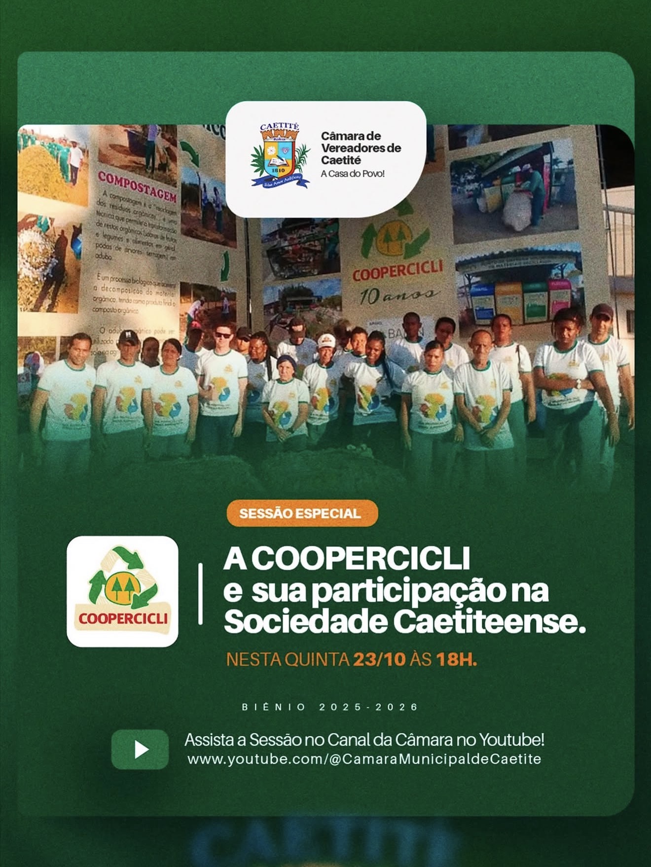A Câmara de Vereadores de Caetité realiza nesta quinta-feira (23/10) Sessão Especial com o tema “A Coopercicli e sua Participação na Sociedade Caetiteense” com transmissão ao vivo por meio do site Caetité Sensacionalista, além das redes sociais oficiais da Casa Legislativa, como Facebook e YouTube, e das rádios autorizadas. Os cidadãos que desejarem acompanhar com regularidade as sessões, audiências públicas e demais atividades do Legislativo podem se inscrever no canal oficial da Câmara no YouTube, onde as transmissões são feitas de forma integral, sem cortes ou edições. Assista a sessão: