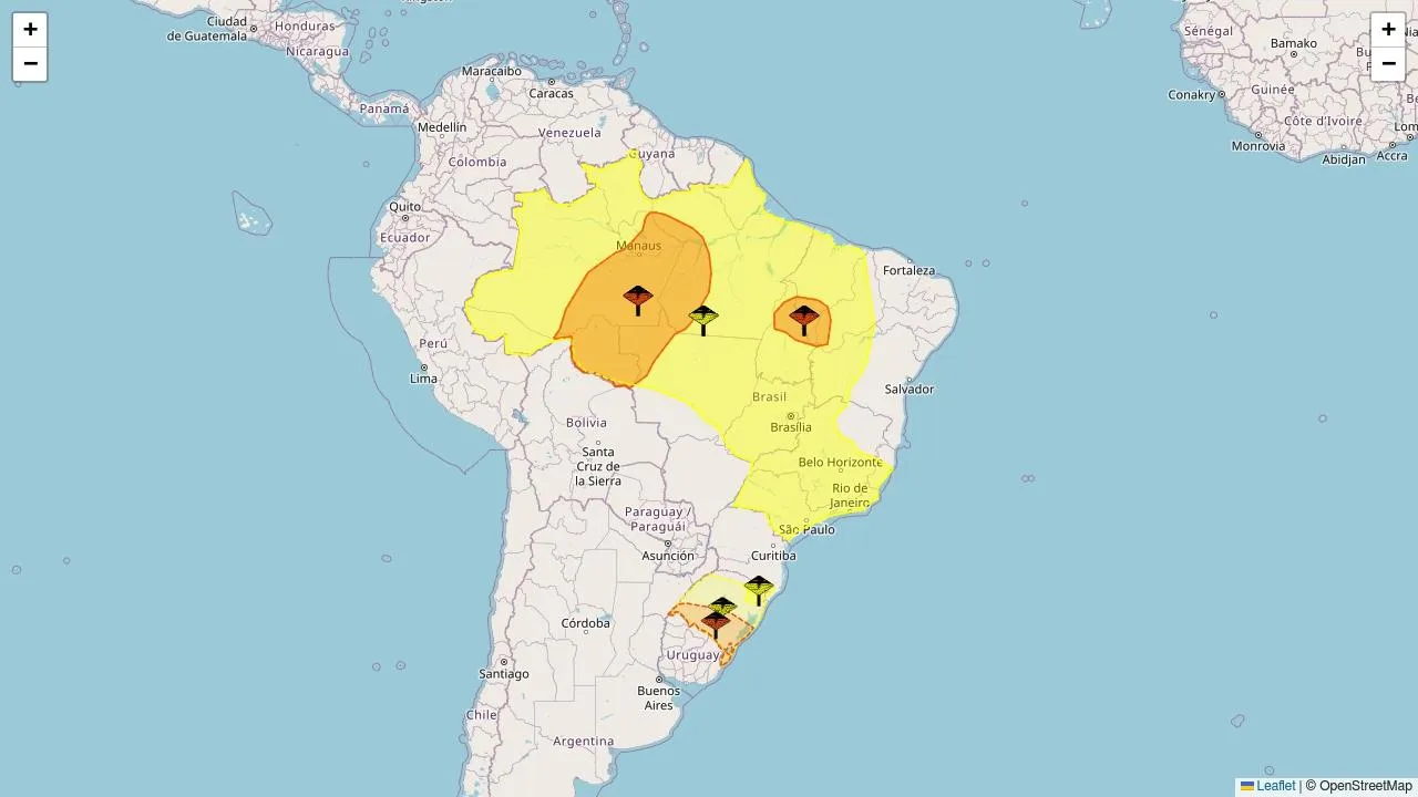 O Instituto Nacional de Meteorologia (Inmet) emitiu seis alertas meteorológicos nas cores amarelo (3) e laranja (3), abrangendo áreas de 3212 municípios de 22 estados.