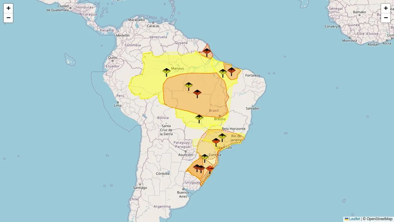 O Instituto Nacional de Meteorologia (Inmet) emitiu treze alertas meteorológicos nas cores amarelo (6) e laranja (7), abrangendo áreas de 3551 municípios de 21 estados.