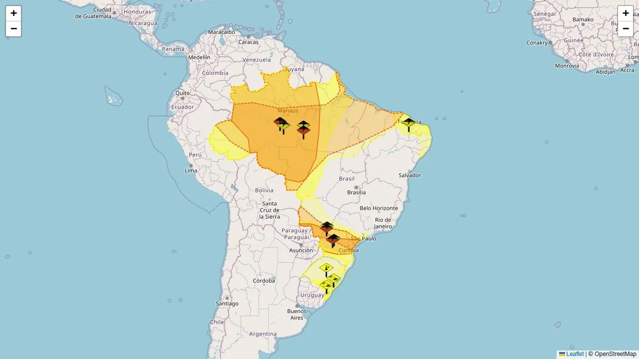 O Instituto Nacional de Meteorologia (Inmet) emitiu doze alertas meteorológicos nas cores amarelo (8) e laranja (4), abrangendo áreas de 2923 municípios de 21 estados.