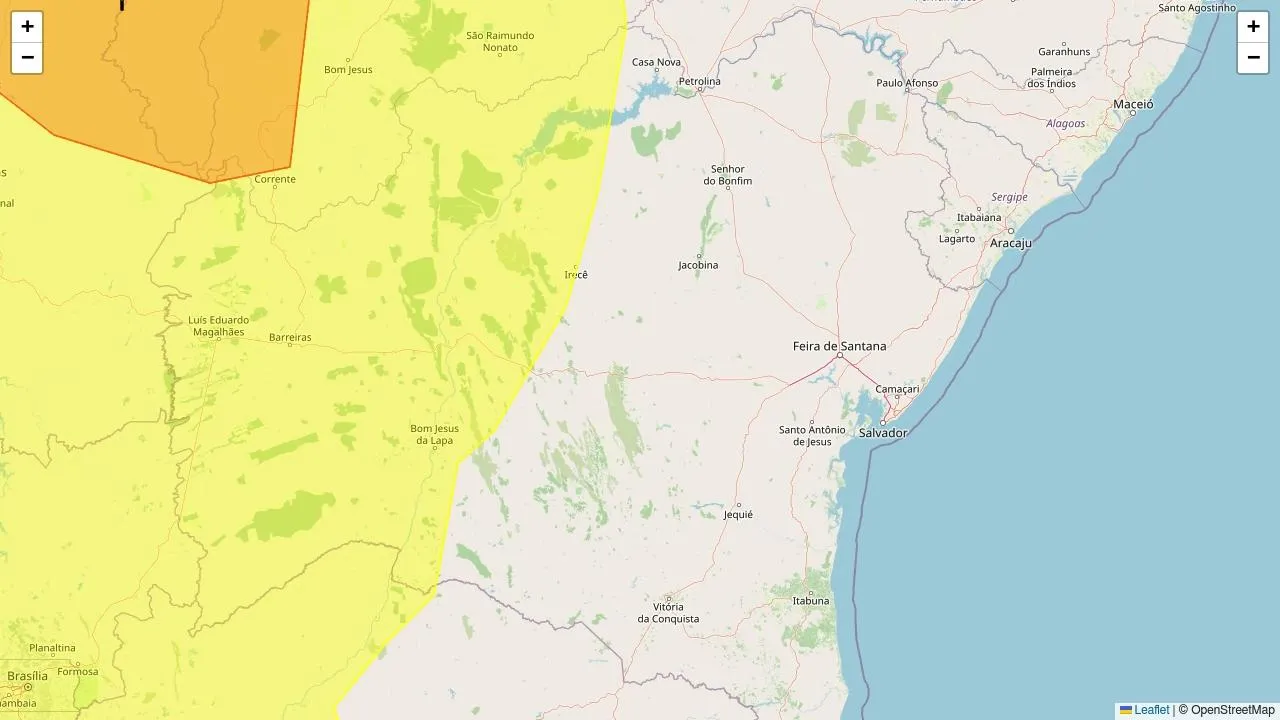 O Instituto Nacional de Meteorologia (Inmet) emitiu dois alertas meteorológicos nas cores amarelo e laranja, abrangendo áreas da Bahia.