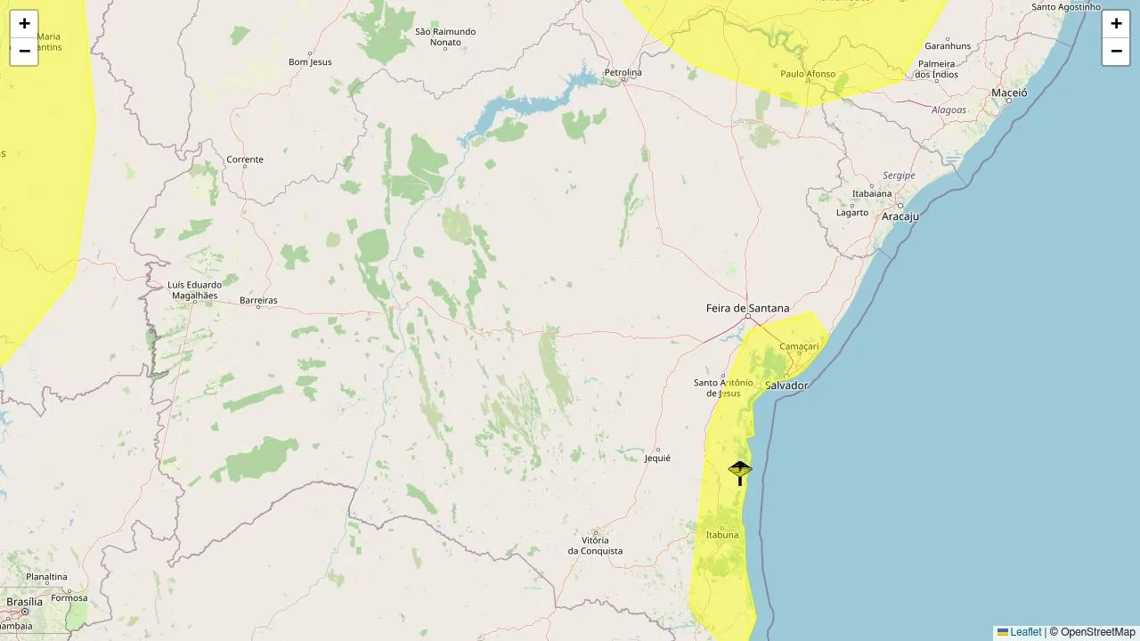 O Instituto Nacional de Meteorologia (Inmet) emitiu dois alertas meteorológicos nas cores amarelo (2), abrangendo áreas da Bahia.