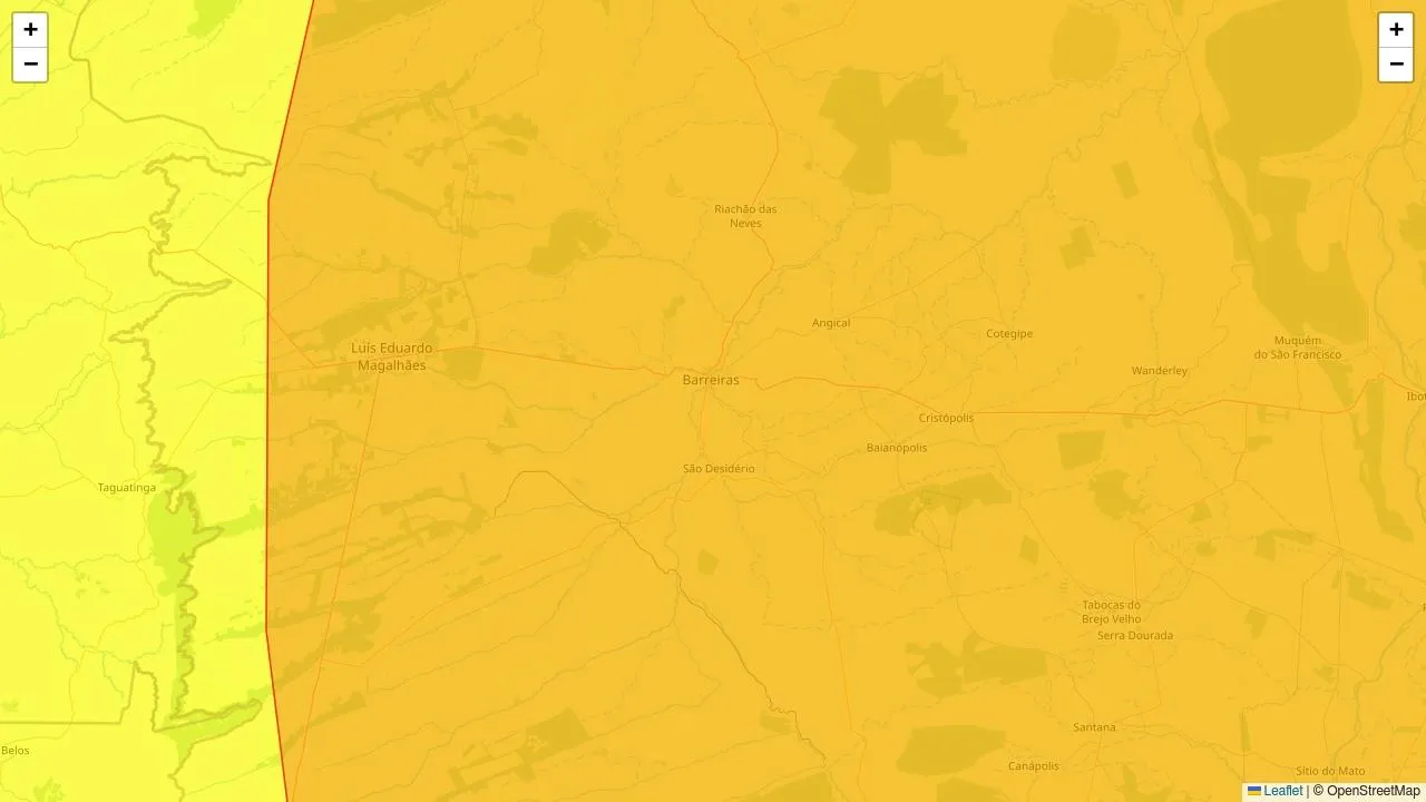O Instituto Nacional de Meteorologia (Inmet) emitiu três alertas meteorológicos nas cores amarelo (2) e vermelho para Barreiras, na Bahia.. Estes alertas vigentes englobam ao todo 3149 municípios de 21 estados.Para Barreiras e demais localidades incluídas, os avisos indicam possibilidade de ocorrência de chuvas intensas, tempestade e acumulado de chuva.