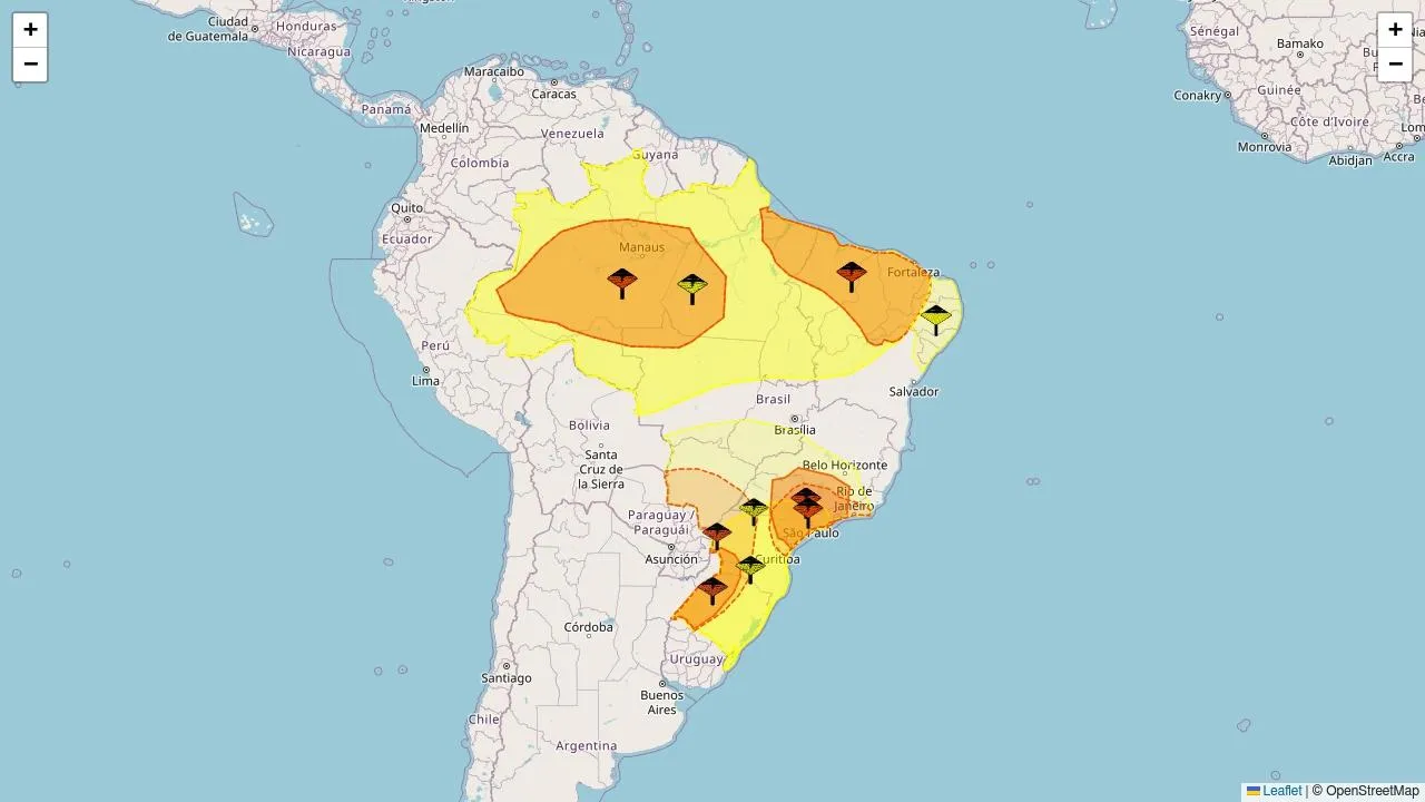 O Instituto Nacional de Meteorologia (Inmet) emitiu dez alertas meteorológicos nas cores amarelo (4) e laranja (6), abrangendo áreas de 4648 municípios de 25 estados.