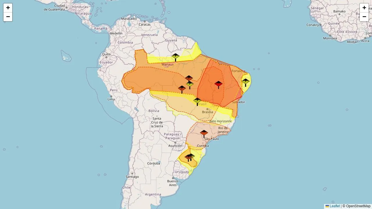 O Instituto Nacional de Meteorologia (Inmet) emitiu onze alertas meteorológicos nas cores amarelo (6), laranja (4) e vermelho, abrangendo áreas de 5336 municípios de 27 estados.