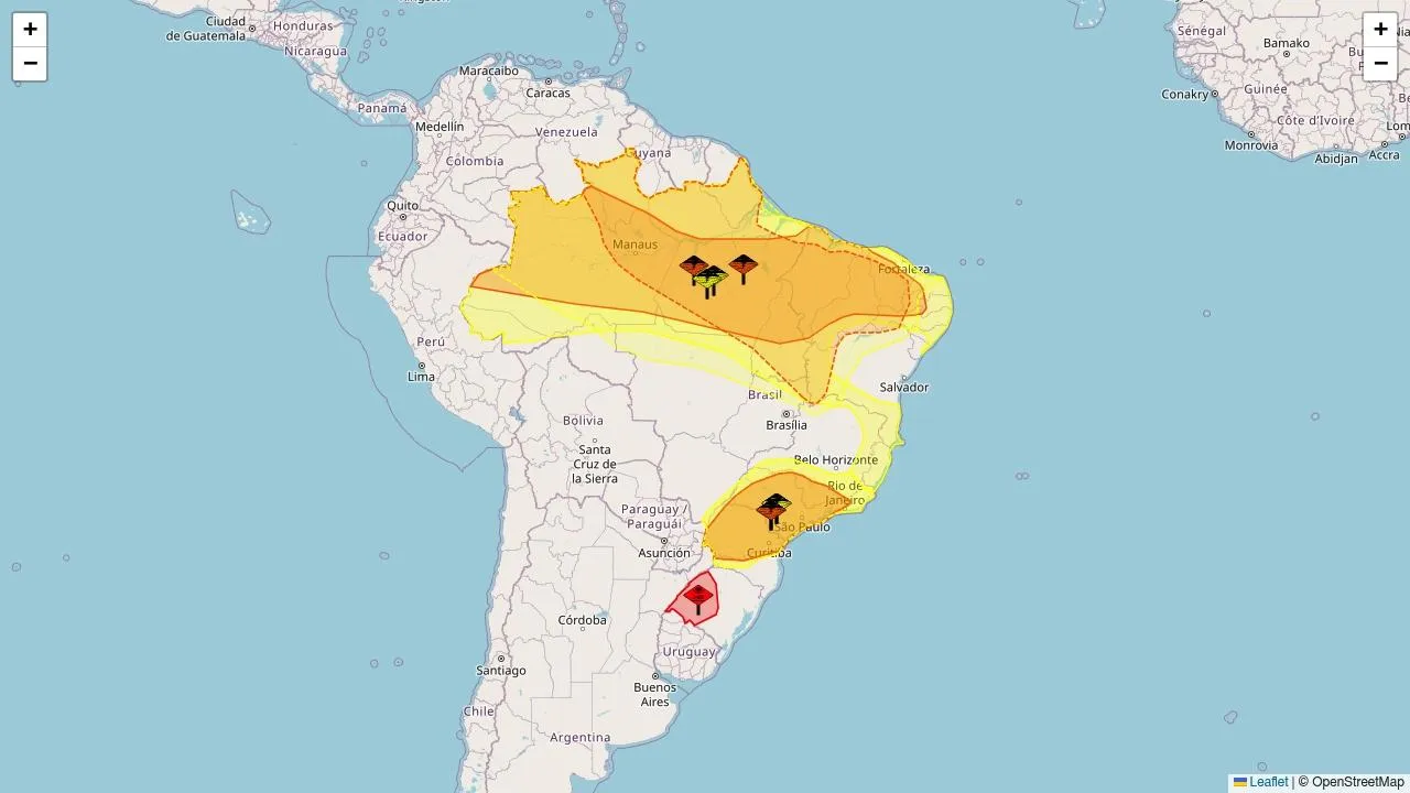 O Instituto Nacional de Meteorologia (Inmet) emitiu sete alertas meteorológicos nas cores amarelo (3), laranja (3) e vermelho, abrangendo áreas de 4022 municípios de 26 estados.