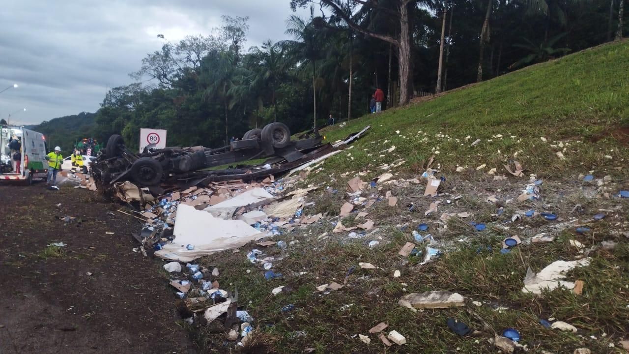 Os dois veículos estavam na faixa da direita no momento em que o caminhão bateu na traseira da caminhonete. Na sequência, o caminhoneiro perdeu o controle do veículo que capotou.