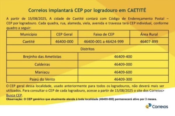 ByRodrigo Azevedo14 de agosto de 2025A partir da próxima sexta-feira (15), Caetité deixará de ter um único CEP geral para todos os endereços e passará a adotar códigos...
