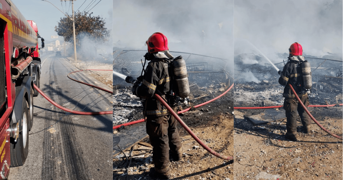 O incêndio de grande proporção mobilizou cinco equipes de bombeiros, desde a madrugada desta sexta-feira (14), em Contagem. Segundo o CBMMG (Corpo de Bombeiros de Minas Gerais), o fogo começou em um lote aberto com materiais recicláveis.