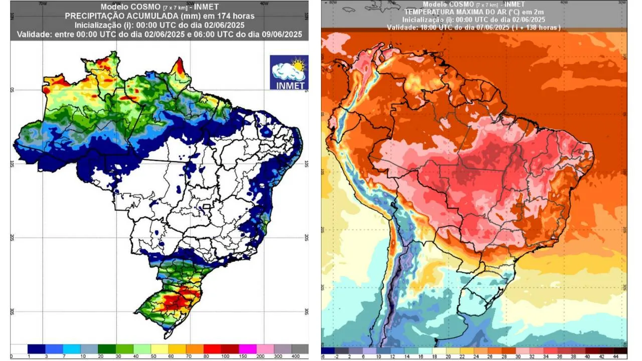 O Instituto Nacional de Meteorologia (Inmet) divulgou nesta segunda-feira, 2 de junho, o Informativo Meteorológico nº 20/2025, com a previsão do tempo válida até o dia 9 de junho.