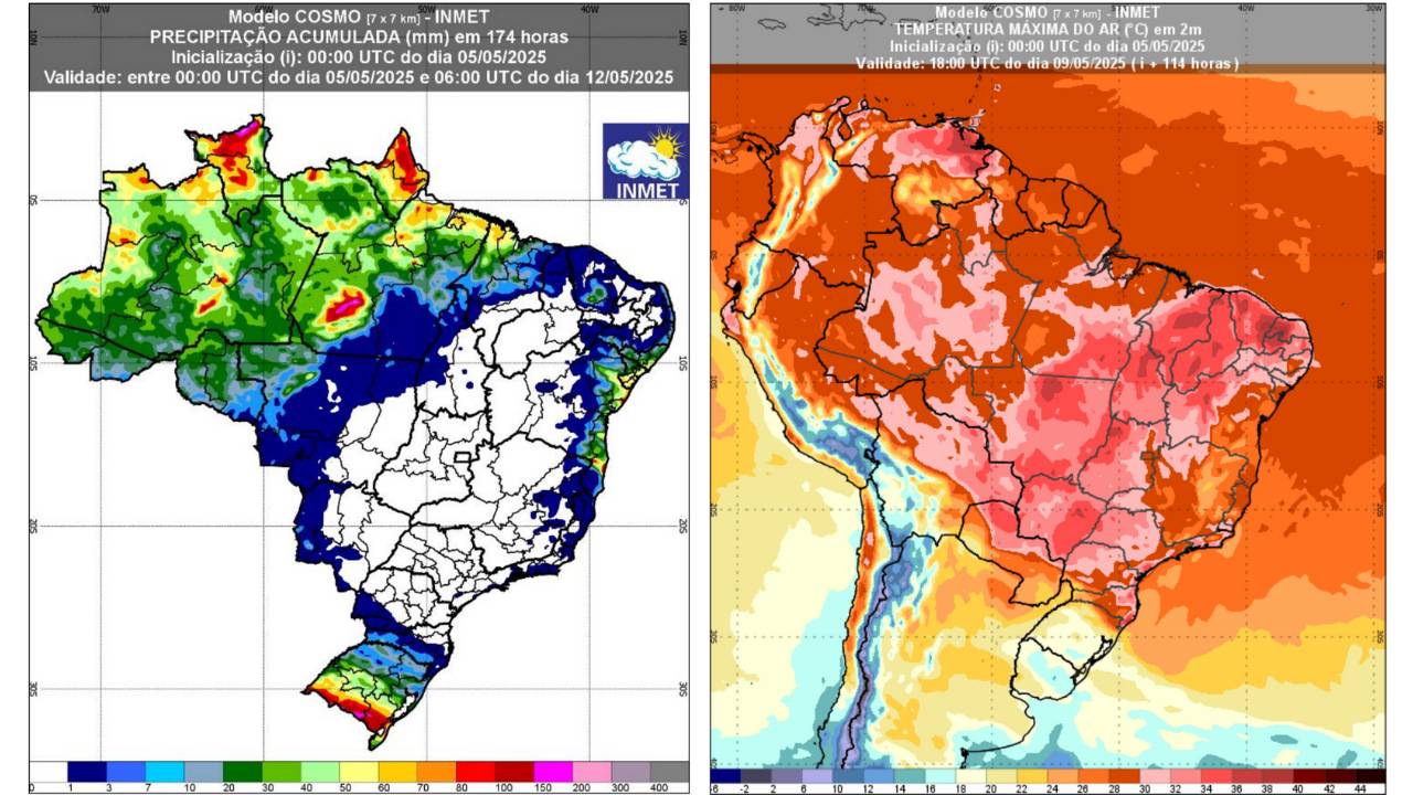 Máximas: devem superar os 30°C no interior do Nordeste, em grande parte do Centro-Oeste, Norte, São Paulo, Triângulo Mineiro, Paraná e Santa Catarina. No dia 9 de maio, as temperaturas máximas podem ultrapassar 34°C em boa parte do país, exceto no Rio Grande do Sul, onde os termômetros devem ficar abaixo de 20°C.