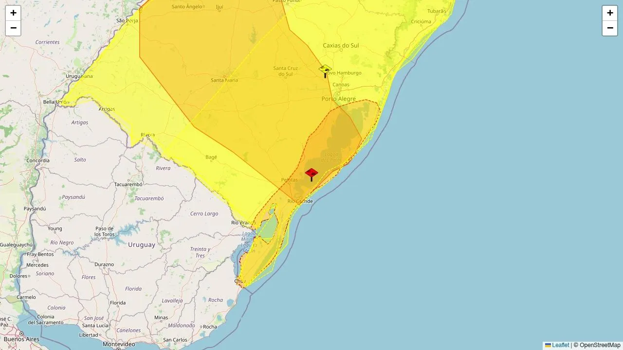 O Instituto Nacional de Meteorologia (Inmet) emitiu um alerta vermelho, de grande perigo para vendaval. O aviso engloba 26 municípios do estado do Rio Grande do Sul.