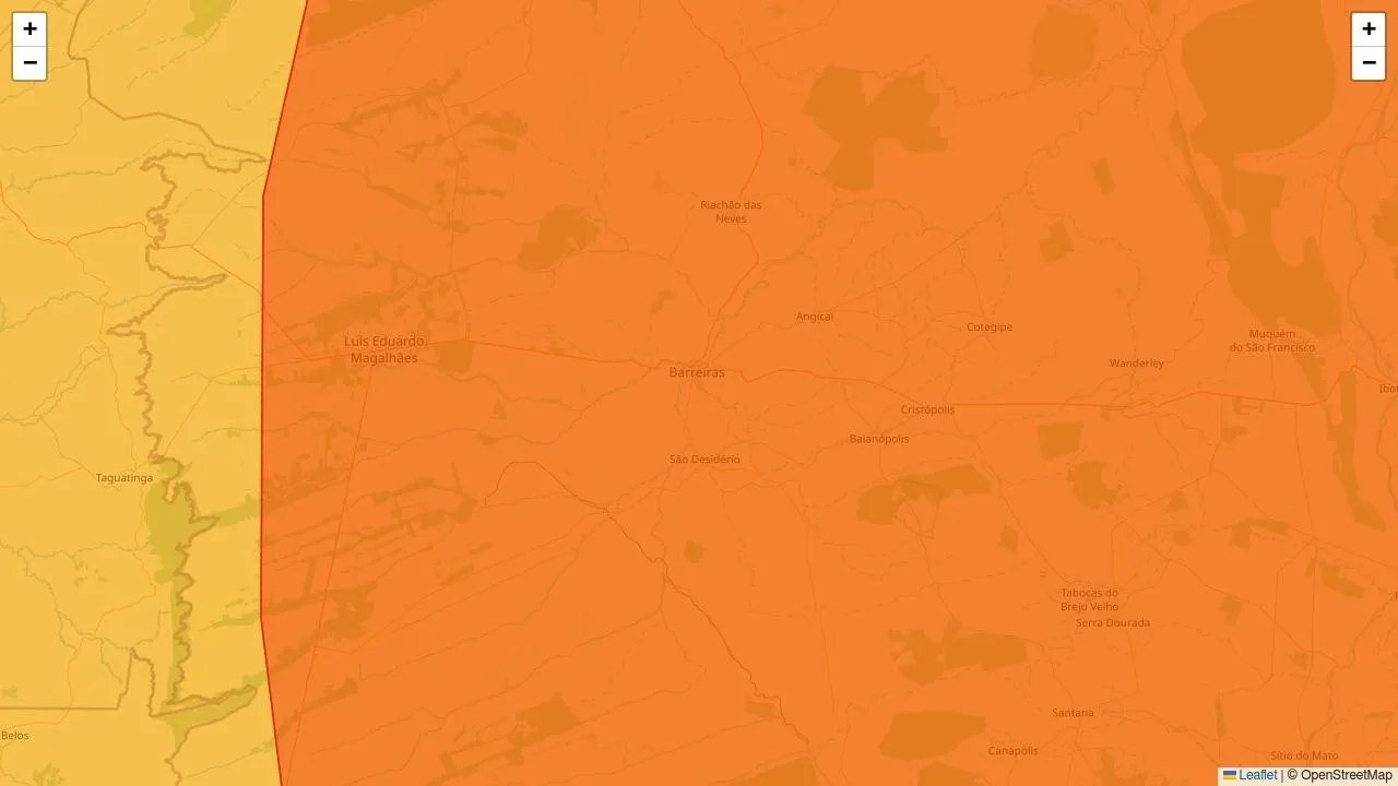 O Instituto Nacional de Meteorologia (Inmet) emitiu três alertas meteorológicos nas cores amarelo, laranja e vermelho para Barreiras, na Bahia.. Estes alertas vigentes englobam ao todo 3727 municípios de 24 estados.Para Barreiras e demais localidades incluídas, os avisos indicam possibilidade de ocorrência de chuvas intensas (2) e acumulado de chuva.