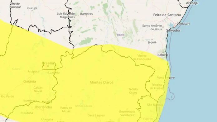 Segundo o Inmet, o alerta engloba áreas das regiões Sul Baiano, Centro Sul Baiano, Vale São-Franciscano da Bahia e Extremo Oeste Baiano.