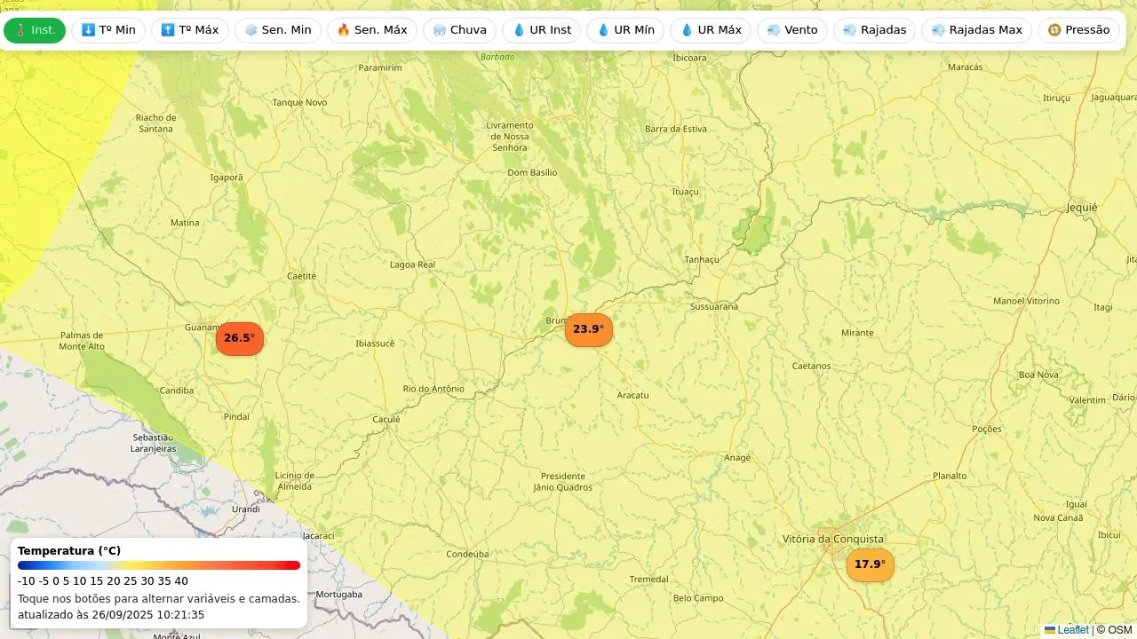 Veja as condições observadas nas estações meteorológicas do Inmet mais próximas e os alertas vigentes para Brumado.