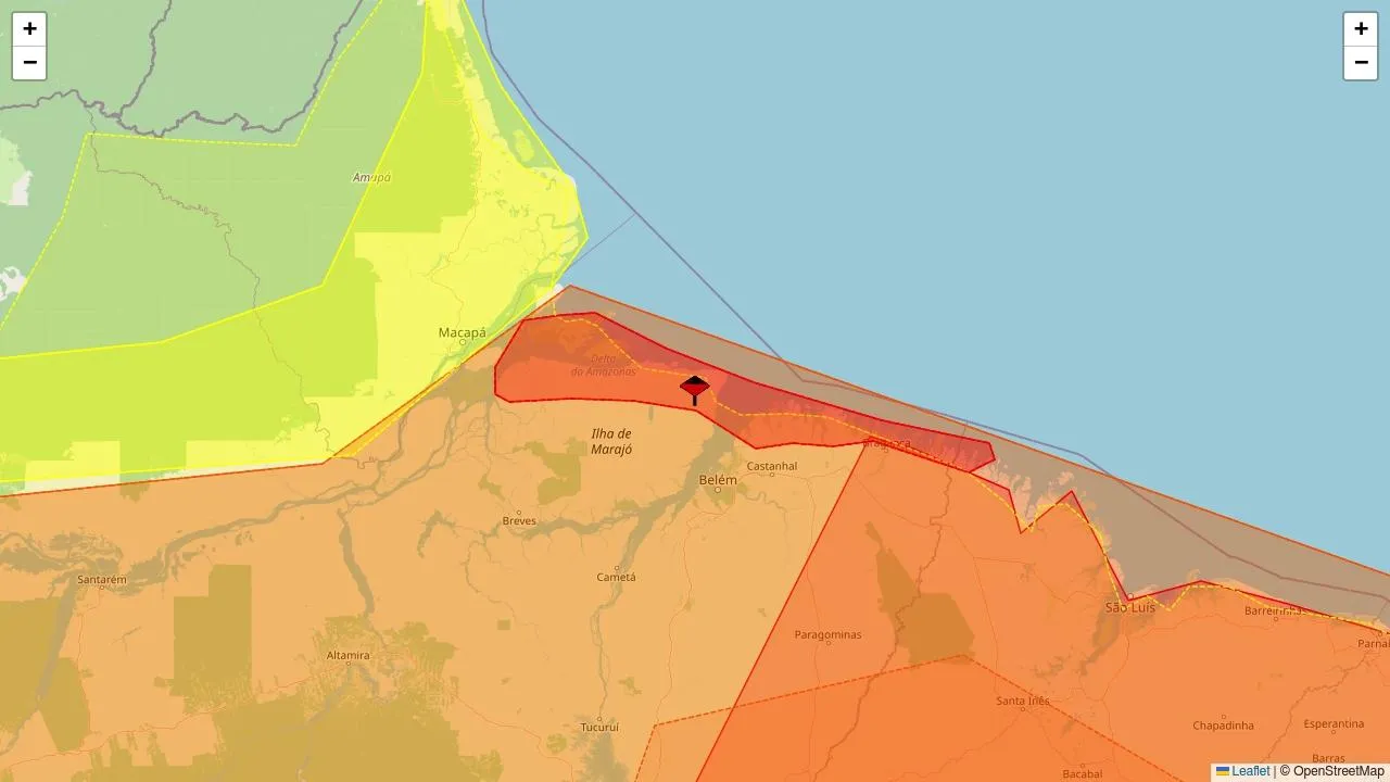 O Instituto Nacional de Meteorologia (Inmet) emitiu um alerta vermelho, de grande perigo para acumulado de chuva. O aviso engloba 32 municípios dos estados do Pará e do Maranhão.