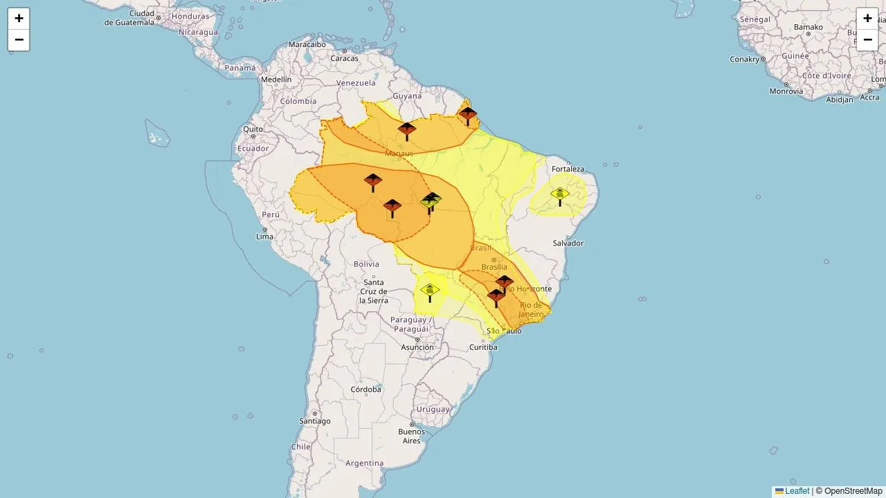 O Instituto Nacional de Meteorologia (Inmet) emitiu dez alertas meteorológicos nas cores amarelo (4) e laranja (6), abrangendo áreas de 3217 municípios de 25 estados.