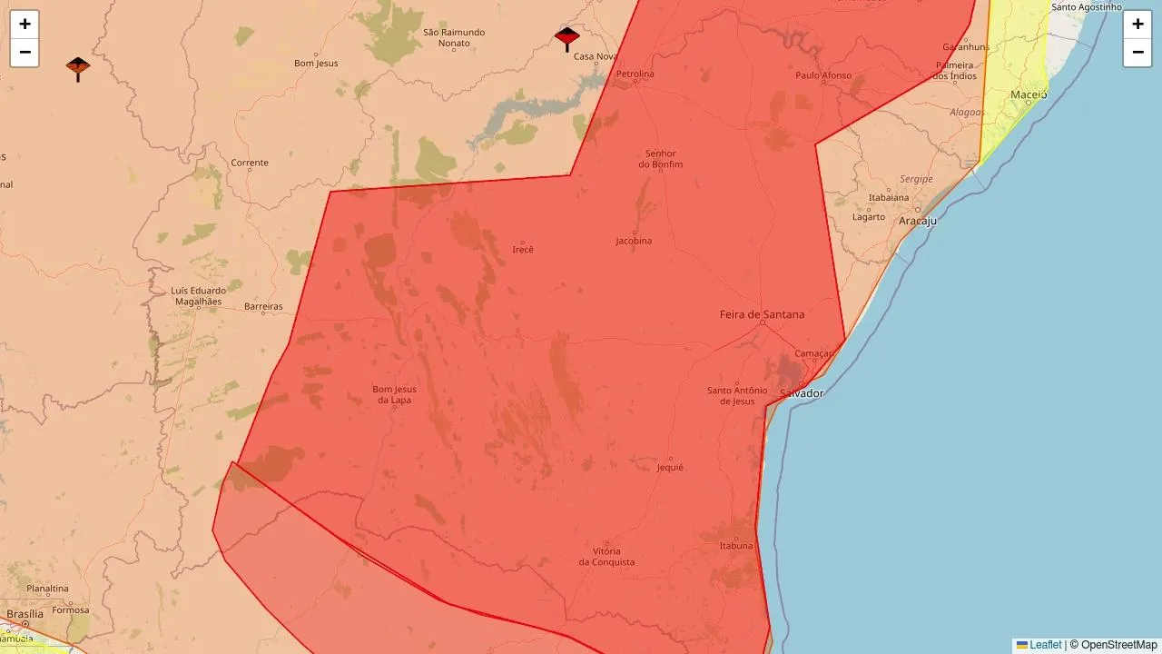 O Instituto Nacional de Meteorologia (Inmet) emitiu três alertas meteorológicos nas cores laranja e vermelho (2), abrangendo áreas da Bahia.