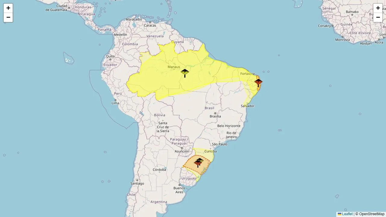 O Instituto Nacional de Meteorologia (Inmet) emitiu cinco alertas meteorológicos nas cores amarelo (3) e laranja (2), abrangendo áreas de 2554 municípios de 20 estados.