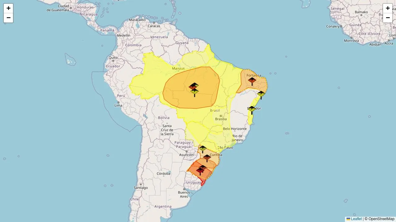 O Instituto Nacional de Meteorologia (Inmet) emitiu dez alertas meteorológicos nas cores amarelo (5), laranja (4) e vermelho, abrangendo áreas de 4556 municípios de 26 estados.