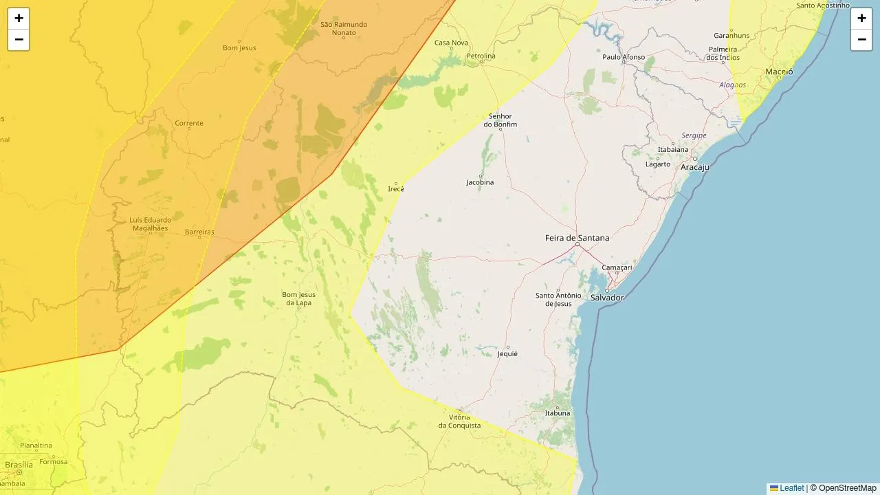 O Instituto Nacional de Meteorologia (Inmet) emitiu três alertas meteorológicos nas cores amarelo (2) e laranja, abrangendo áreas da Bahia.