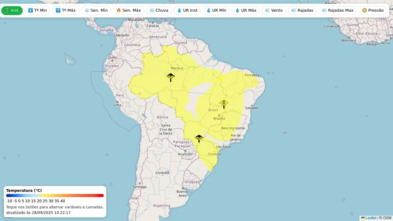 Veja as condições observadas nas estações meteorológicas do Inmet mais próximas e os alertas vigentes para todo o país.