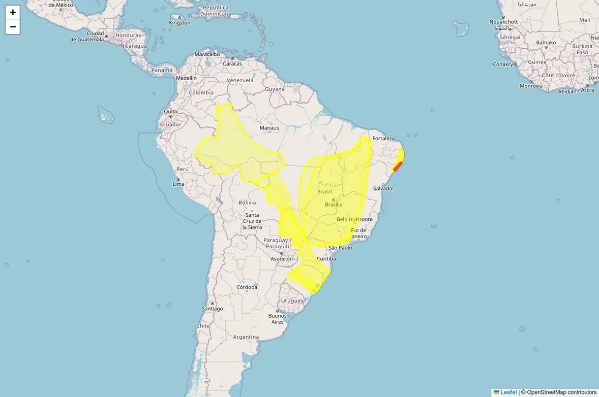 Estados com áreas sob alerta: Bahia, Ceará, Distrito Federal, Goiás, Maranhão, Mato Grosso do Sul, Minas Gerais, Paraná, Pará, Pernambuco, Piauí, Mato Grosso, Rio de Janeiro, São Paulo, Tocantins.