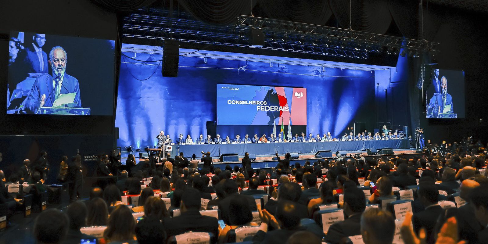 Para uma plateia composta por centenas de advogados, de governadores e outros chefes de Poderes, Lula enfatizou o papel histórico da OAB na defesa da democracia, da justiça e dos direitos humanos, mas observou que é preciso manter a vigilância contra novas ameaças autoritárias, mencionando a tentativa de golpe contra a democracia nos fatos que levaram aos ataques de 8 de janeiro de 2023.