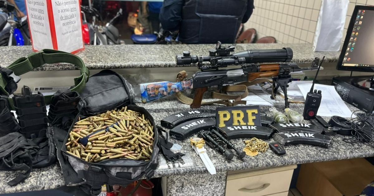 Durante a vistoria no interior do automóvel, os policiais encontraram um fuzil AK-47, oito carregadores, 616 munições de calibre 7,62, cinco porta-carregadores, dois bipés, duas granadas, uma mira telescópica, um rádio comunicador com base e duas baterias, além de um cinto tático.