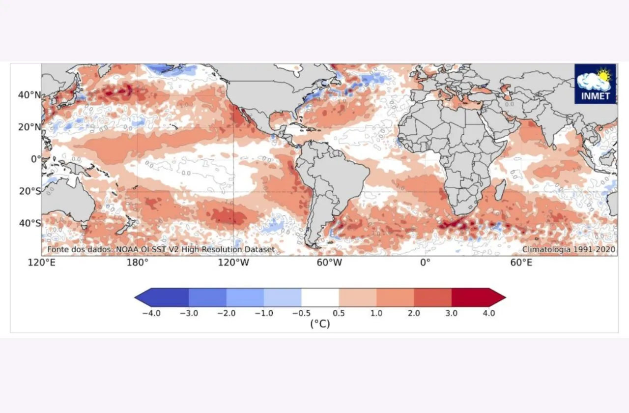 Ainda assim, o boletim destaca que esse resultado ficou acima do registrado no mês anterior, indicando enfraquecimento do resfriamento das águas superficiais do Pacífico Equatorial.