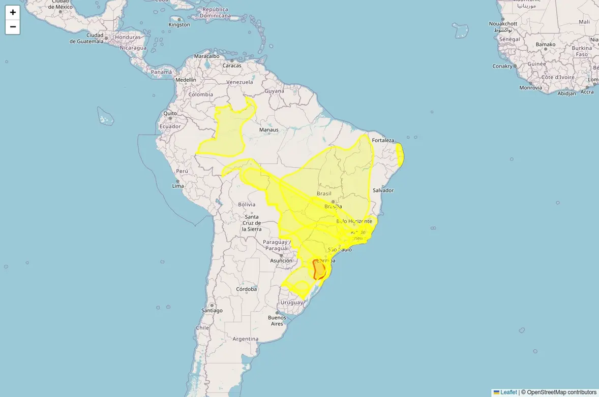 Estados com áreas sob alerta: Paraná, Rio Grande do Sul, Santa Catarina.