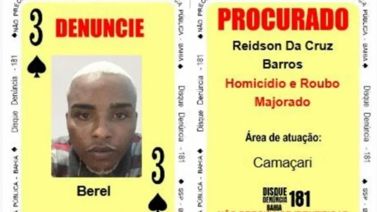 A Polícia Civil da Bahia, por meio do Departamento Especializado de Investigações Criminais (Deic), prendeu na manhã desta quinta-feira, 25 de setembro, Reidson da Cruz Barros, conhecido como “Berel”, que figurava como carta Três de Espadas no Baralho do Crime da Secretaria da Segurança Pública (SSP).