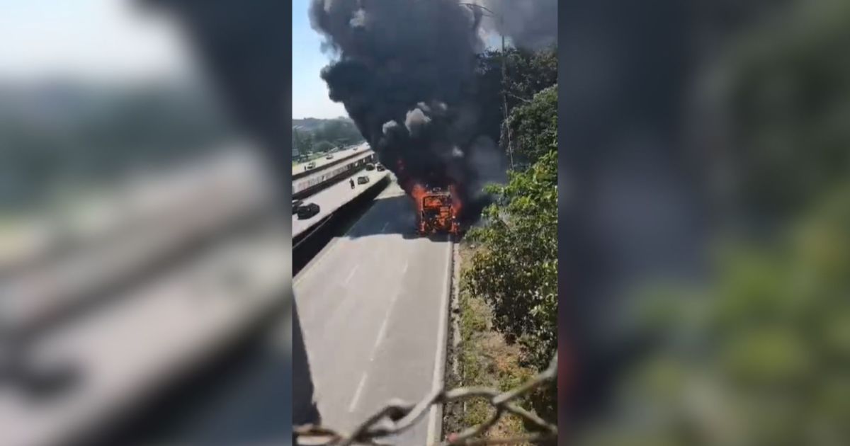 Imagens cedidas pela página VIVA ABC à CNN Brasil mostram o veículo em chamas e uma grande nuvem de fumaça preta à beira da rodovia.