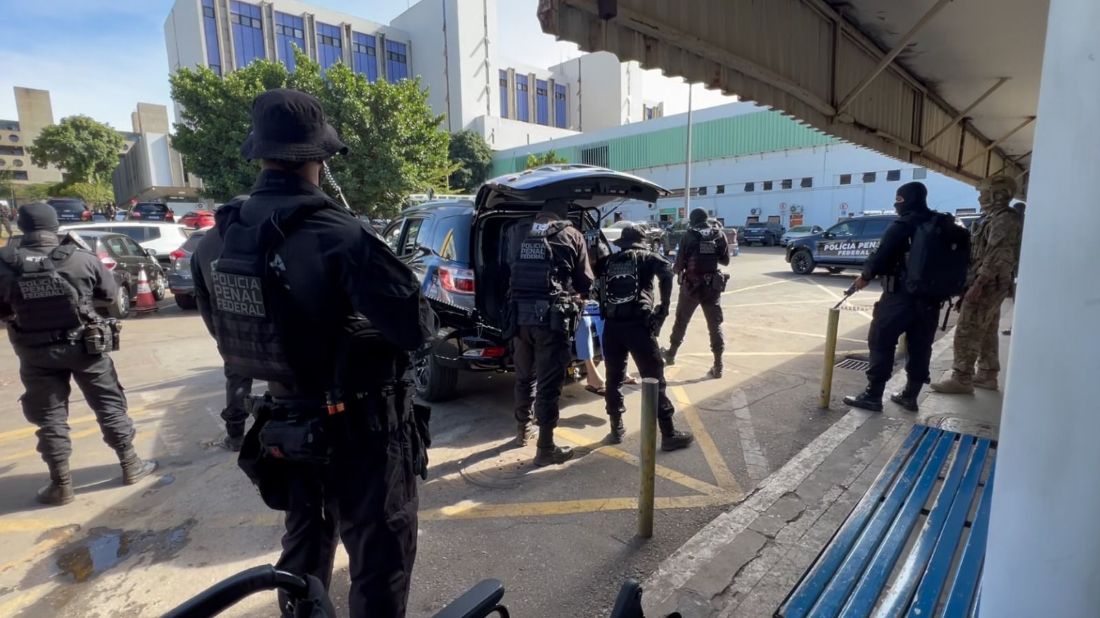 As imagens mostram o criminoso sendo escoltado por diversas viaturas da Polícia Penal Federal (PPF) a caminho do Hospital de Base de Brasília. Até mesmo um helicóptero acompanhou o deslocamento.